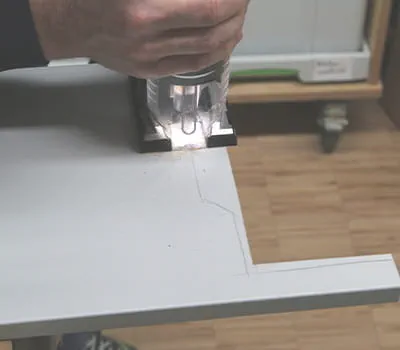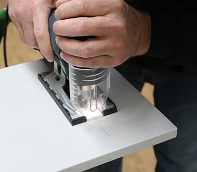 Dans la prochaine étape, la scie sauteuse permet ensuite de découper le long du tracé. Très bonne visibilité du tracé grâce à la lumière de la scie. Veiller à ce que la pièce soit toujours bien fixée.