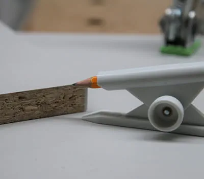 La baguette d'ajustement est ensuite maintenue à l'intérieur sur le côté de l'armoire de façon affleurante et le contour du mur est reporté avec le trusquin parallèle. Étant donné que l'épaisseur du côté de l'armoire est réglée sur le trusquin parallèle, la moulure s'adapte ensuite exactement dans l'écart à cacher.
