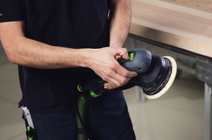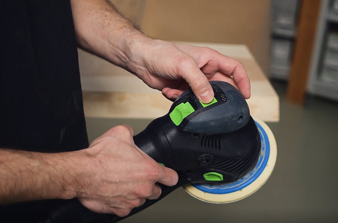 Beim Feinschliff müssen die entstandenen Schleifspuren soweit hochgeschliffen werden, dass sie nach der Oberflächenbehandlung nicht mehr sichtbar sind. Dafür bleibt zunächst die Körnung P120 auf der Maschine. Der Rotex wird auf die exzenter-Bewegung (Feinschliff) umgestellt. Anschließend werden die Schleifspuren des Grobschliffs herausgeschliffen. Auch hier wird im Kreuzgang gearbeitet.