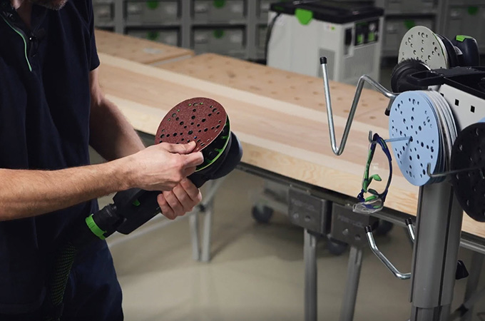 Gehobelte Holzflächen haben durch die Hobelmesser sogenannte Messerschläge oder auch Hobelschläge genannt. Diese müssen vor der Oberflächenbeschichtung geschliffen werden. Dadurch erhält man zum einen eine glatte homogenere Fläche und zum anderen hat die Oberflächenbeschichtung einen besseren Halt oder kann besser in das Holz eindringen. Wer keine große stationäre Schleifmaschine besitzt, erledigt diesen Arbeitsschritt mit Handschleifmaschinen. Der ROTEX eignet sich hier optimal, weil er Grobschliff und Exzenterschliff in einer Maschine vereint. Da diese Arbeit vor allem in der Werkstatt erfolgt, ist es von Vorteil, sich den Arbeitsplatz entsprechend gut einzurichten. Deshalb wollen wir hier auch kurz auf unser Systemzubehör eingehen.