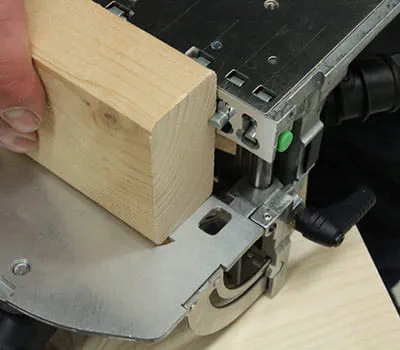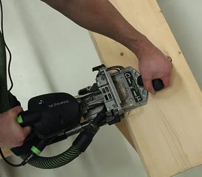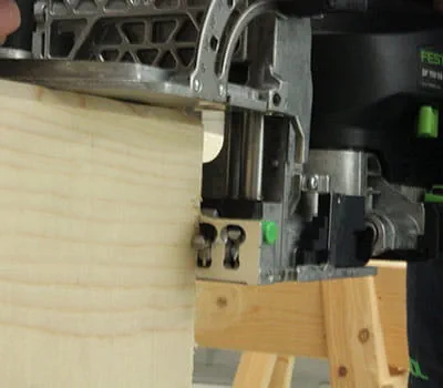 Nun DOMINO XL an der Pfostenmarkierung ansetzen und die erste Fräsung durchführen. Dann die zweite Fräsung durchführen und dabei darauf achten, dass der Anschlagpin (mittlerer) wieder in der ersten Fräsung anliegt.