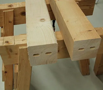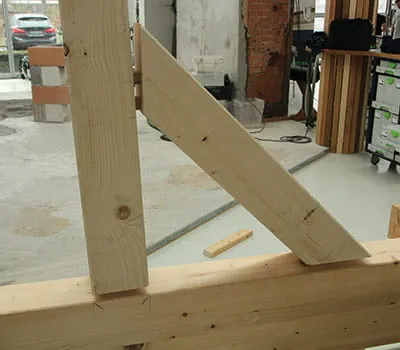 Beim Verbinden von Konstruktionshölzern werden traditionelle Holzverbindungen wie Zapfen und Zapfenloch heutzutage häufig durch verschiedene Metallverbindungen (Schrauben, Winkel, Bolzen etc.) ersetzt. Der Vorteil von traditionellen Holzverbindungen ist die einfache Montage, da die Pfetten und Pfosten ineinander gesteckt werden können. Im vorliegenden Anwendungsbeispiel werden Flachdübel statt einer Zapfenverbindung eingesetzt, um eine Steckverbindung herzustellen. Das beschleunigt die Montage und liefert sauberste Ergebnisse. Eingesetzt wird hierzu hauptsächlich die Domino XL Flachdübelfräse.
