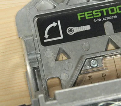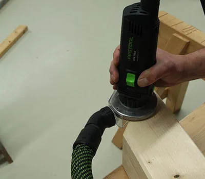Für die erste Fräsung an den Pfostenenden wird der mittlere Anschlagpin gewählt. Dieser entspricht der Position des dreieckigen Sichtfensters am Anschlagstisch. An den Pfostenenden kann somit mittels Anschlagpin und an den Pfetten über das Sichtfenster angelegt werden. Bei Arbeiten mit der DOMINO XL muss zwingend ein Absaugmobil angeschlossen werden.